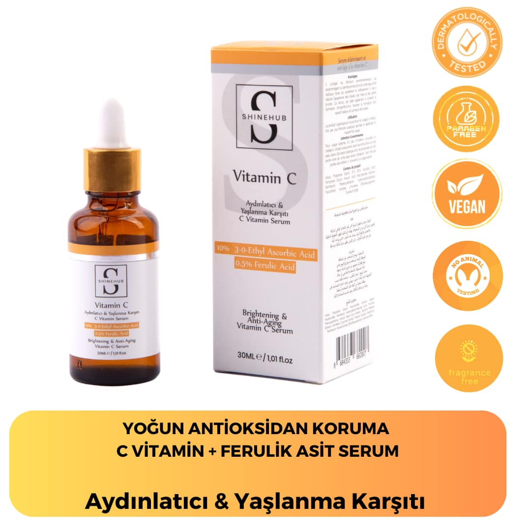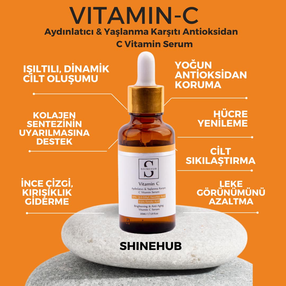 SHINEHUB C-Vitamin serumu; Güneşin zararlı etkilerine karşı ciltte kalkan görevi gören, antioksidan bir serum özelliğini taşır.